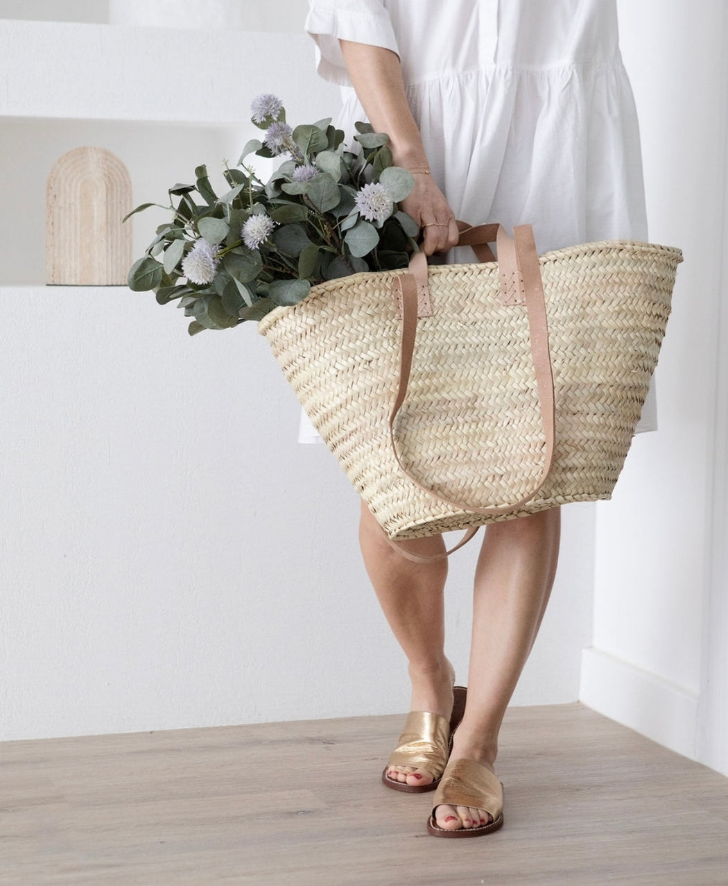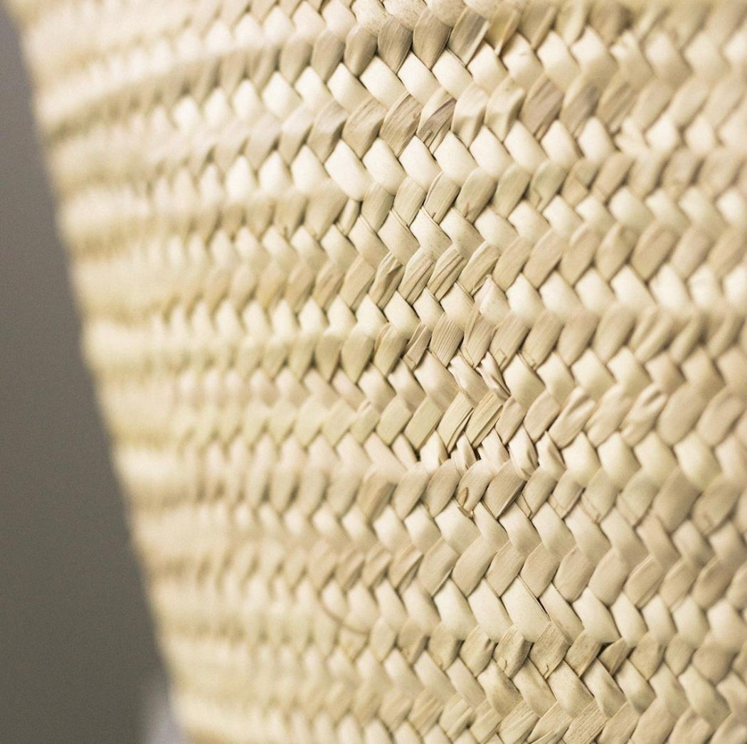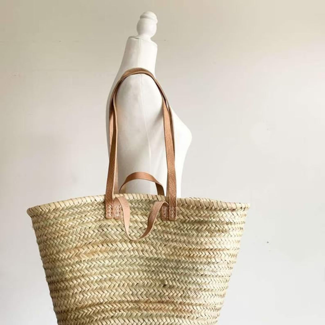 Ce classique du marché français est tissé à la main au Maroc à partir de feuilles de palmier dattier, créant une riche texture à chevrons de fibres naturelles robustes. Ancrées par des languettes en cuir, les doubles bretelles permettent au panier de passer du sac fourre-tout au sac à bandoulière.